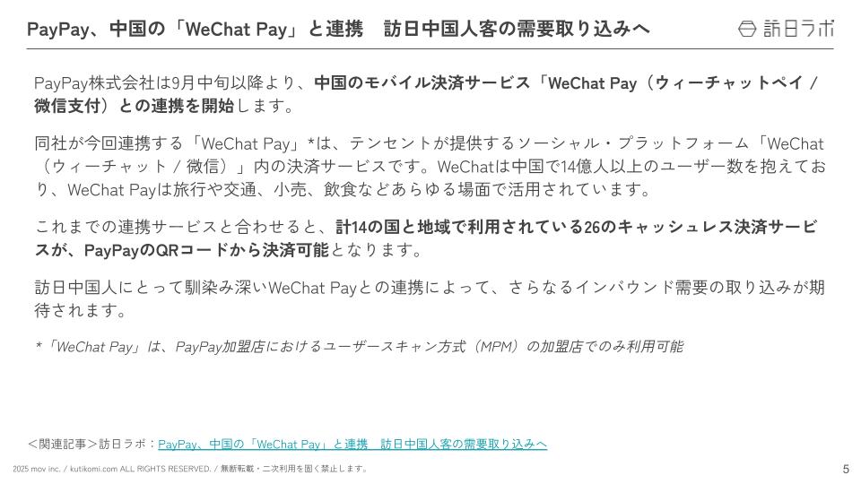 <関連記事>訪日ラボ:PayPay、中国の「WeChat Pay」と連携 訪日中国人客の需要取り込みへ