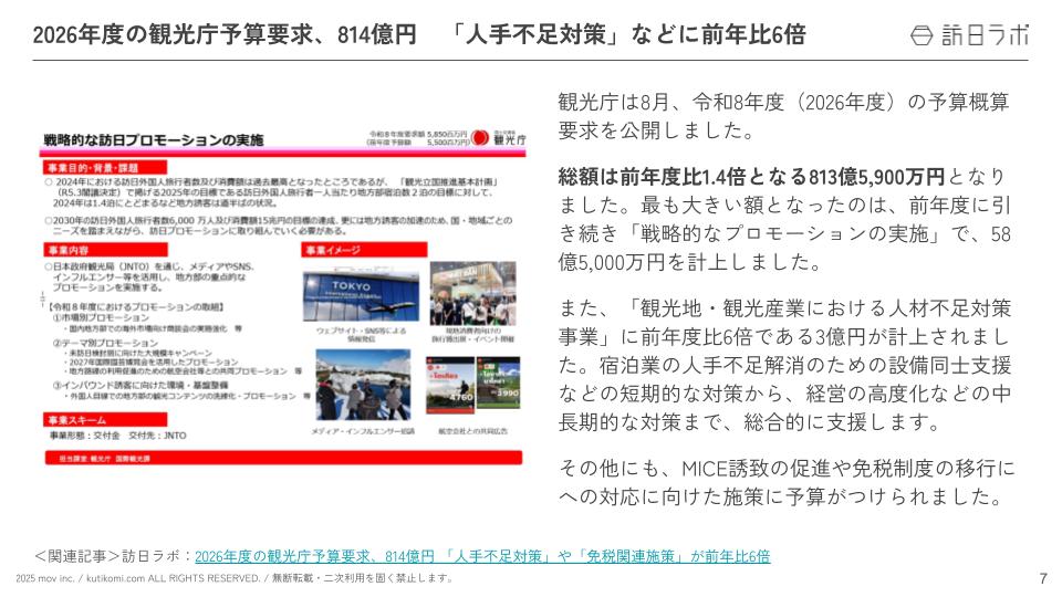 <関連記事>訪日ラボ:2026年度の観光庁予算要求、814億円 「人手不足対策」や「免税関連施策」が前年比6倍