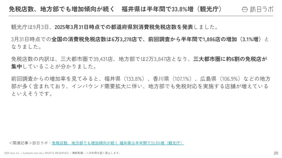 <関連記事>訪日ラボ:免税店数、地方部でも増加傾向が続く 福井県は半年間で33.8%増(観光庁)