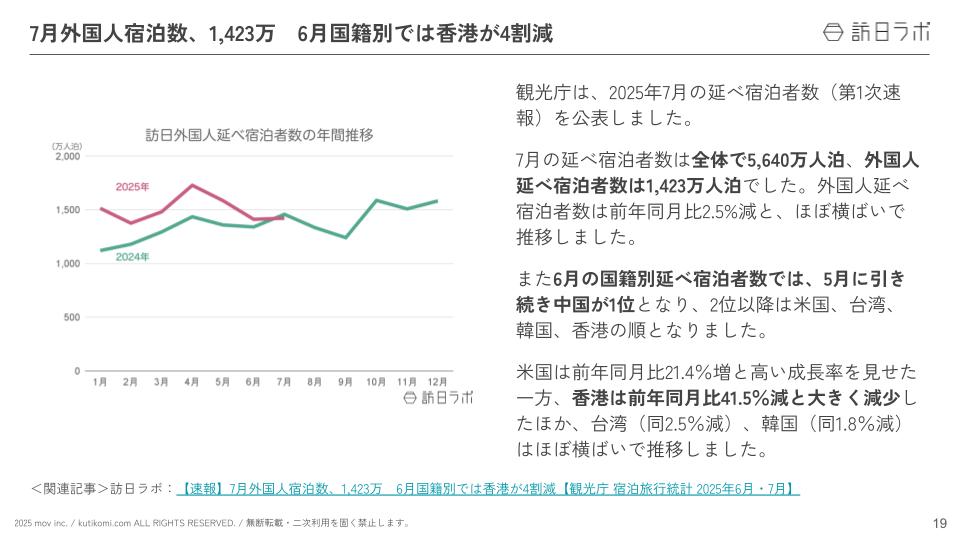 <関連記事>訪日ラボ:7月外国人宿泊数、1、423万 6月国籍別では香港が4割減【観光庁 宿泊旅行統計 2025年6月・7月】