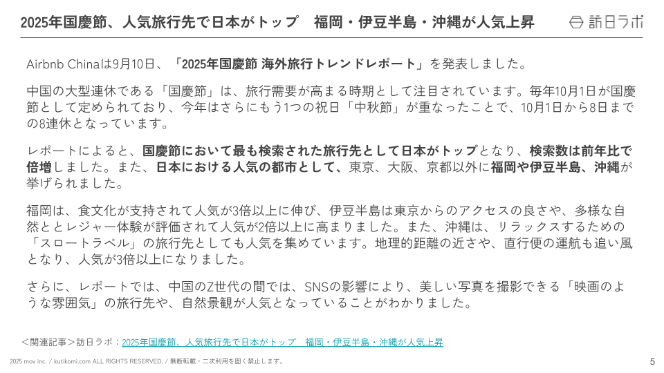 <関連記事>訪日ラボ:2025年国慶節、人気旅行先で日本がトップ 福岡・伊豆半島・沖縄が人気上昇