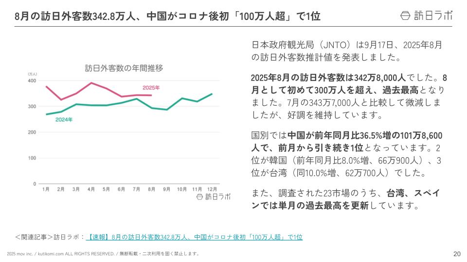 <関連記事>訪日ラボ:【速報】8月の訪日外客数342.8万人、中国がコロナ後初「100万人超」で1位