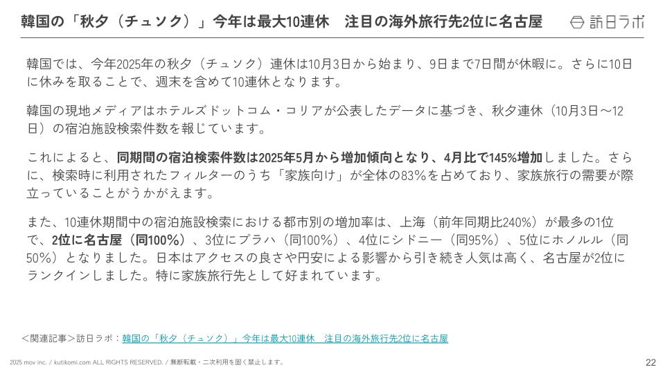 <関連記事>訪日ラボ:韓国の「秋夕(チュソク)」今年は最大10連休 注目の海外旅行先2位に名古屋