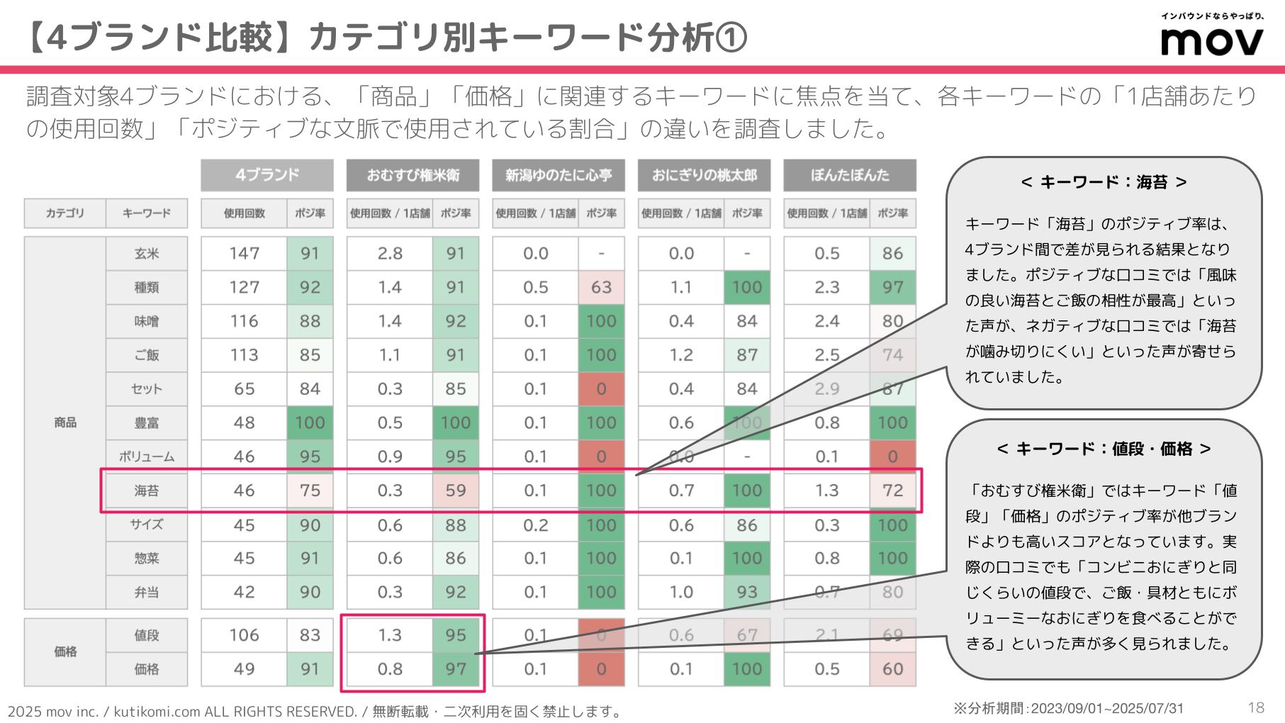 こちらの表では、調査対象4ブランドにおける、「商品」「価格」に関連するキーワードに焦点を当て、各キーワードの「1店舗あたりの使用回数」「ポジティブな文脈で使用されている割合」の違いを調査しています。