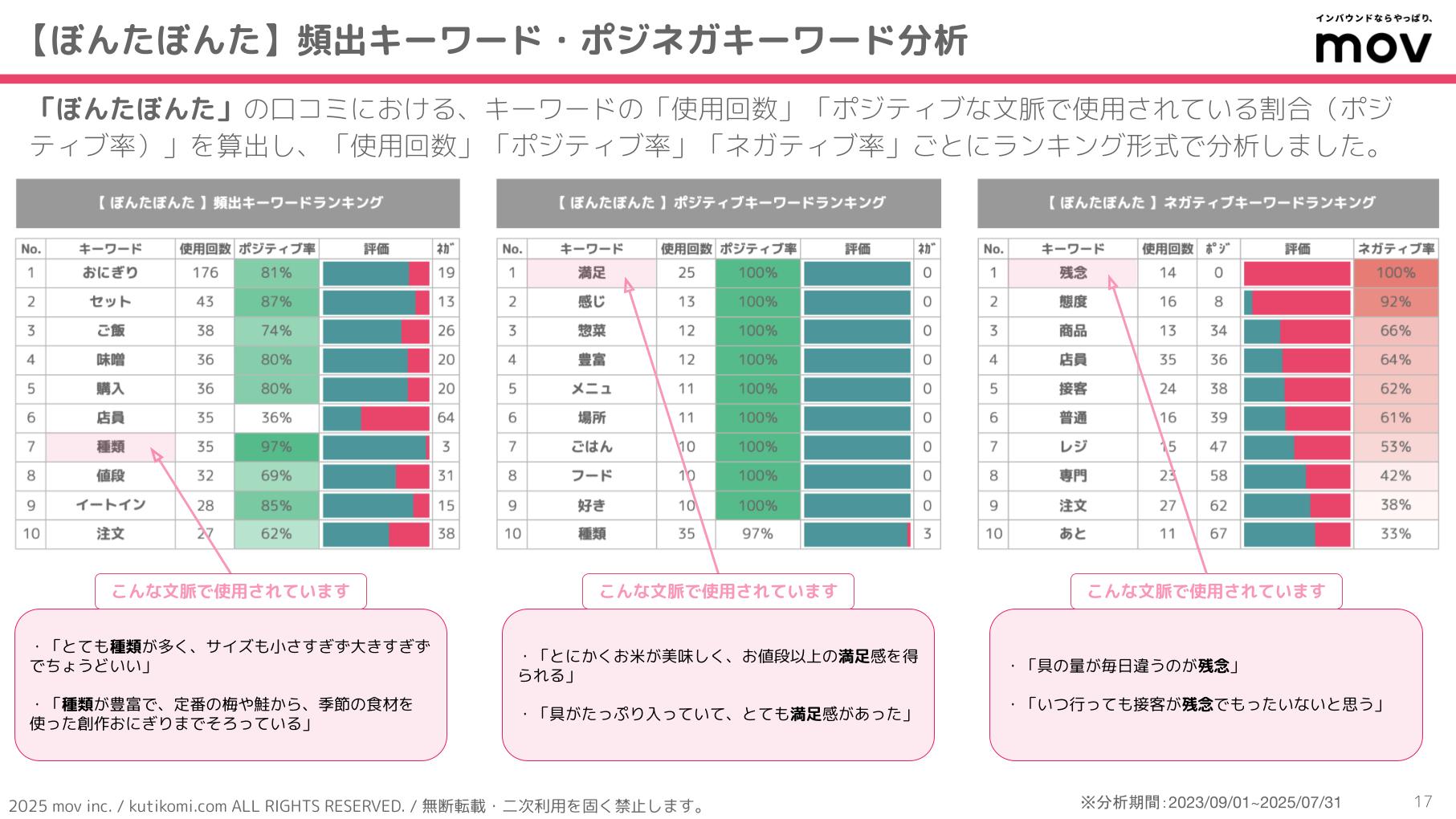 こちらの表では「ぼんたぼんた」の口コミにおける、キーワードの「使用回数」「ポジティブな文脈で使用されている割合(ポジティブ率)」を算出し、「使用回数」「ポジティブ率」「ネガティブ率」ごとにランキング形式で分析しています。