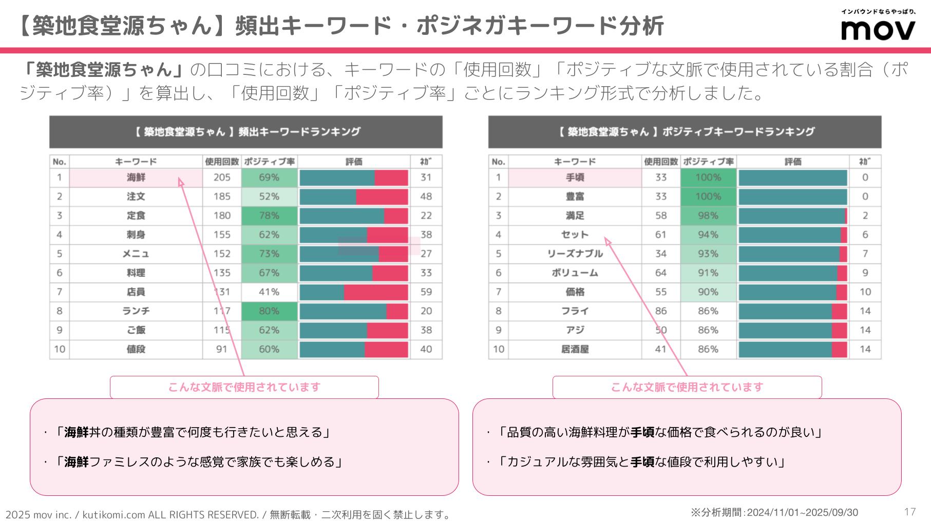 こちらの表では「築地食堂源ちゃん」の口コミにおける、キーワードの「使用回数」「ポジティブな文脈で使用されている割合(ポジティブ率)」を算出し、「使用回数」「ポジティブ率」ごとにランキング形式で分析しています。