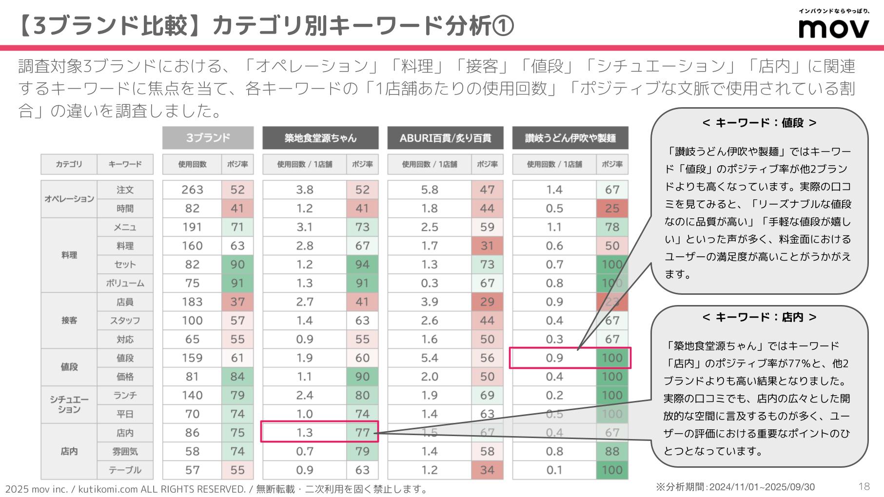 こちらの表では、調査対象3ブランドにおける、「オペレーション」「料理」「接客」「値段」「シチュエーション」「店内」に関連するキーワードに焦点を当て、各キーワードの「1店舗あたりの使用回数」「ポジティブな文脈で使用されている割合」の違いを調査しています。