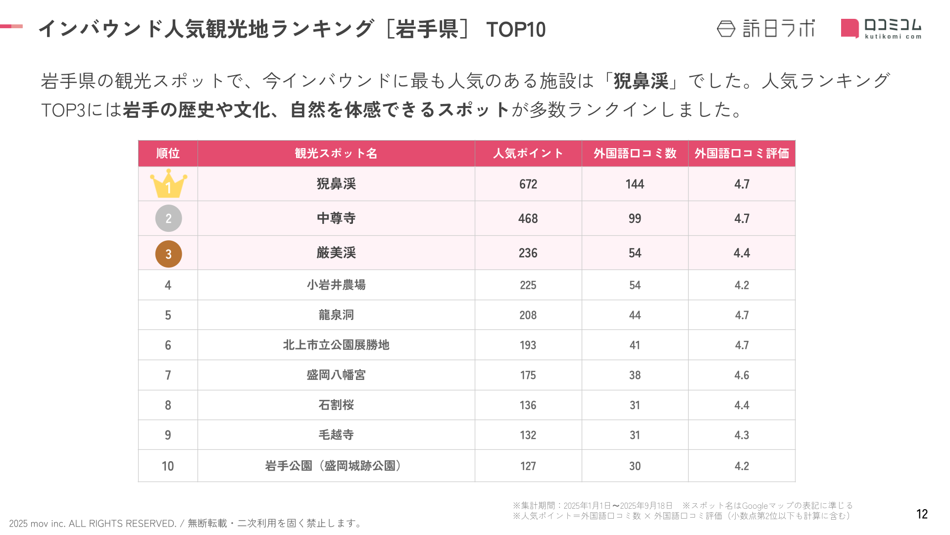 訪日ラボ・口コミコムが独自に調査した『インバウンド人気観光地ランキング』岩手編。